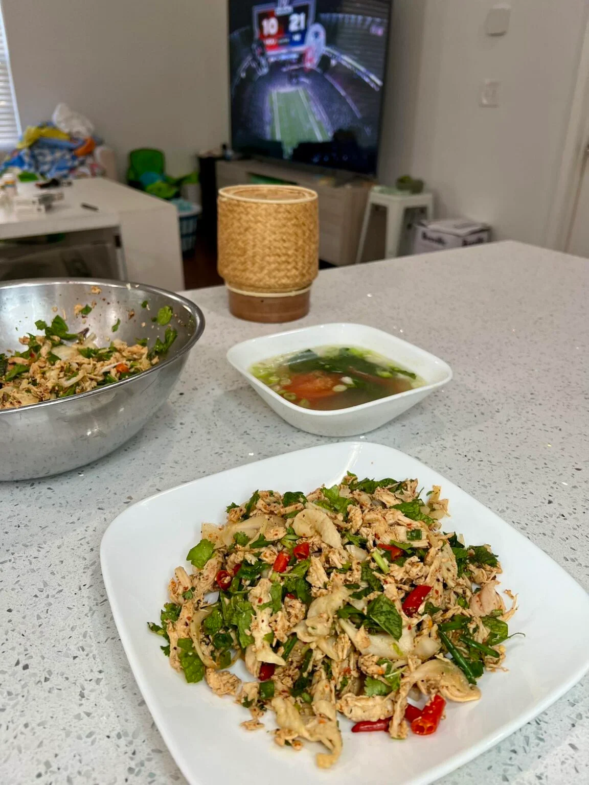 - Add celery, onion, and any optional mix-ins to the chicken.