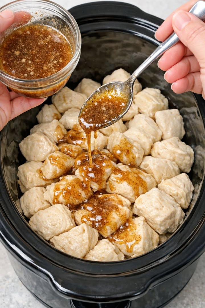 Assemble in the slow cooker: Add the biscuit pieces to the greased slow cooker crock. If using nuts, sprinkle them over the dough pieces. Slowly drizzle the entire butter–brown sugar–cinnamon–vanilla mixture evenly over the biscuit dough pieces, making sure to coat as many surfaces as you can. Use a spoon or spatula to gently toss and spread the pieces so the mixture seeps down between them, but don’t pack them too tightly.