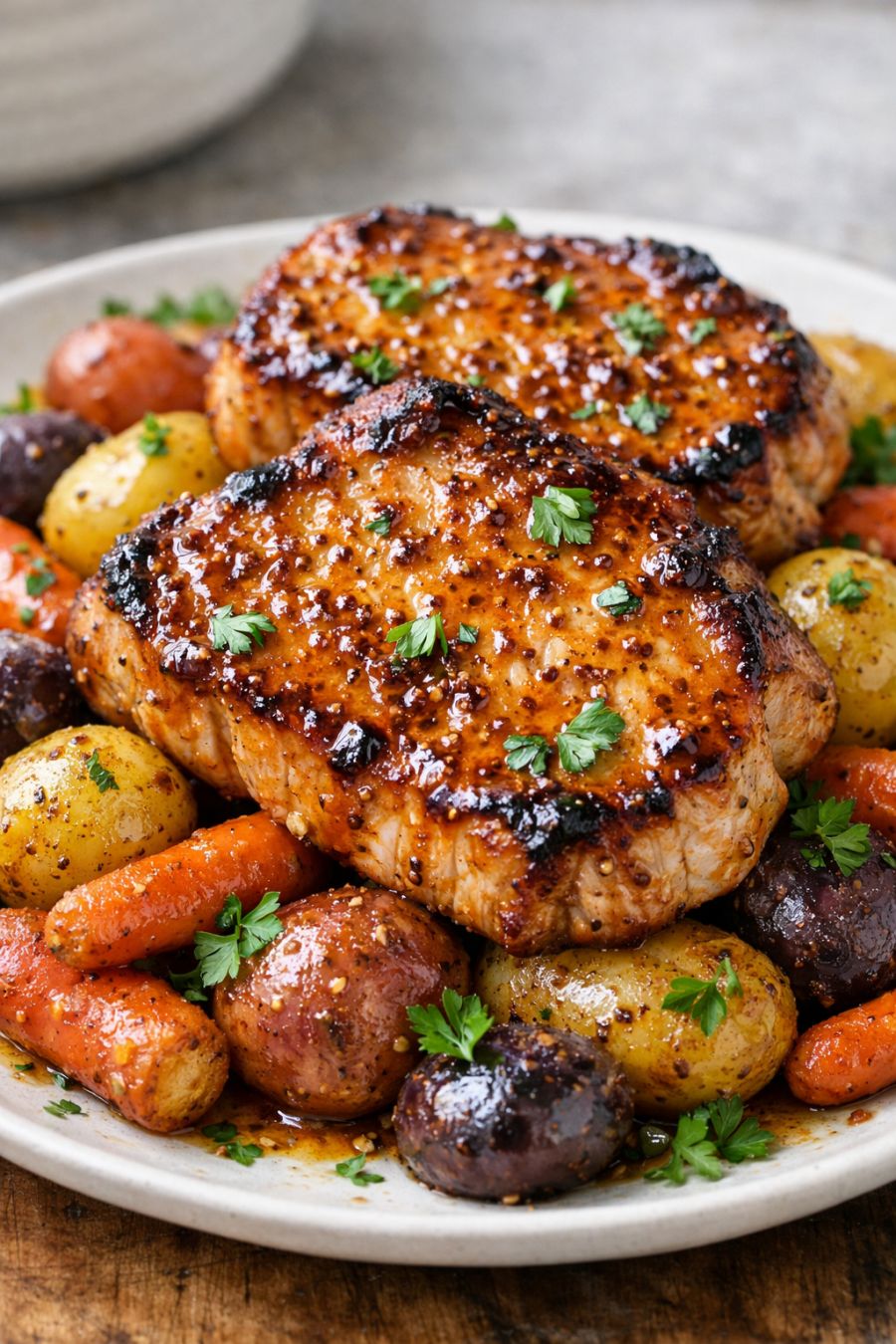 Pour the honey-mustard dressing evenly over the pork chops and vegetables, making sure all of the meat is lightly coated. Do not add extra water—there will be plenty of liquid once the pork and vegetables release their juices.