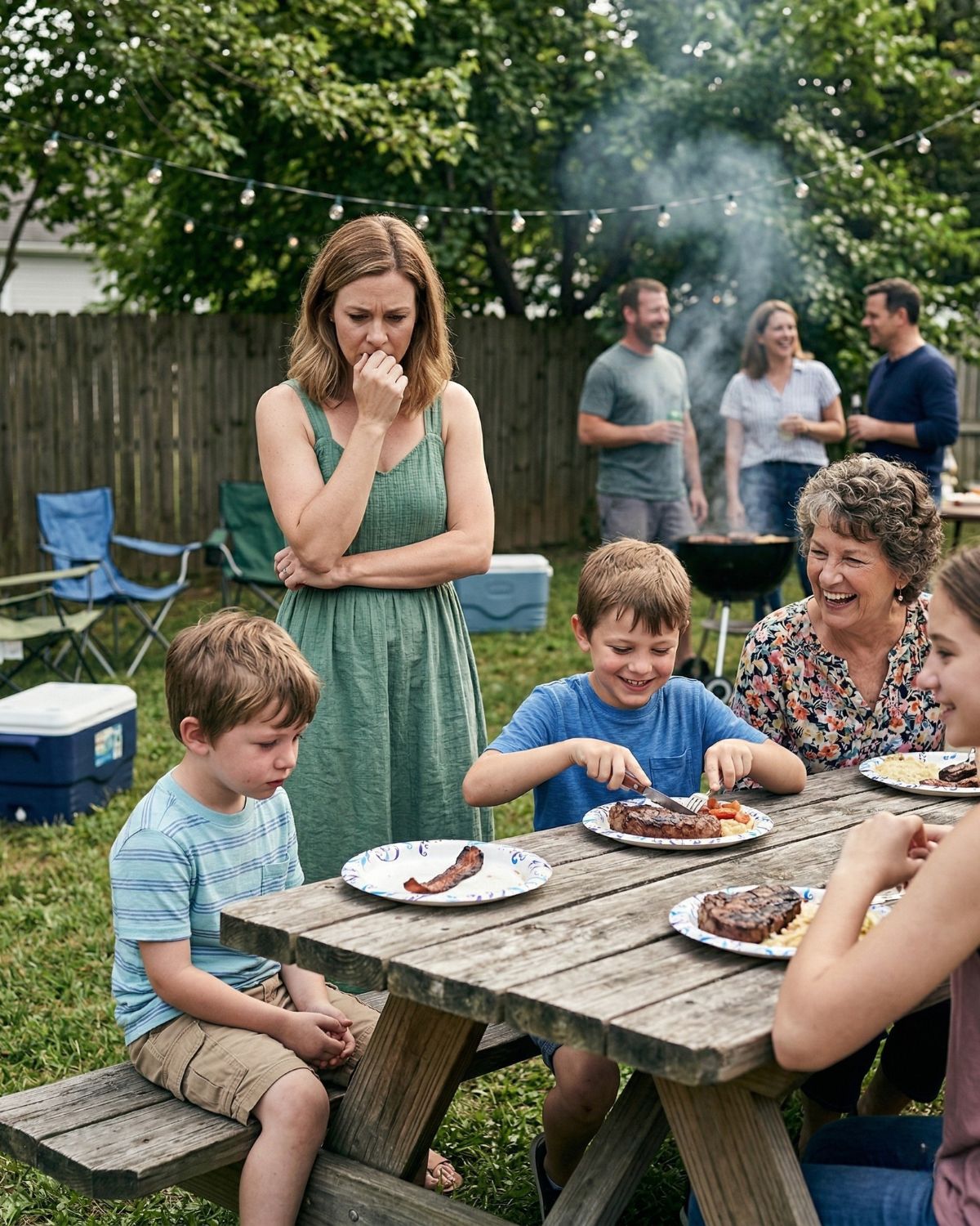 During a family barbecue, my sister’s son was served a beautiful, thick T-bone steak, while my son was given nothing but a burnt piece of fat. My mother giggled and said, “That’s more than enough for a kid like him.” My sister laughed and added, “Even a dog would eat better than that!” My son looked down at his plate and said quietly, “Mom, I’m happy with this meat.” An hour later, when I realized the truth behind those words, I began to tremble with terror.