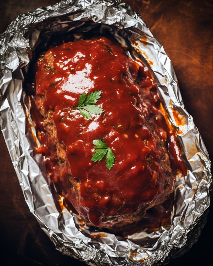 5. Once done, lift meatloaf out with foil overhang and top with 2/3 cup glaze. Put in broiler until glaze gets sticky.