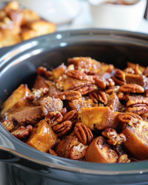 4. Pour the egg mixture evenly over the cinnamon roll pieces in the slow cooker, then sprinkle with pecans if using.