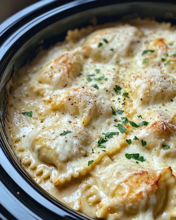 For a vegetarian version, replace the chicken with sautéed spinach or mushrooms. If you prefer a bit of heat, add a pinch of red pepper flakes to the Alfredo sauce. If a slow cooker is unavailable, you can layer the ingredients in a baking dish and bake in a preheated oven at 350°F (175°C) for about 30-40 minutes, or until the cheese is golden and bubbly. Feel free to experiment with different types of ravioli, such as spinach and cheese, for added flavor.