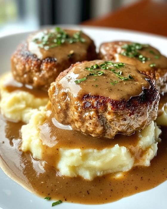 Serve the Salisbury steak with the garlic herb gravy spooned over the top.