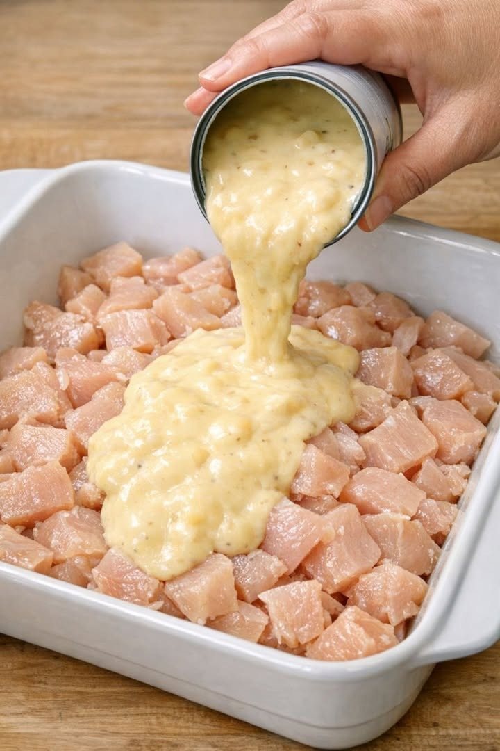 This creamy, comforting casserole comes together with just five ingredients and one dish. No pre-cooking the chicken, no complicated steps—just stir everything together and let the oven do the work. It’s the kind of no-fuss meal that tastes like a church potluck favorite but fits perfectly into a busy weeknight.