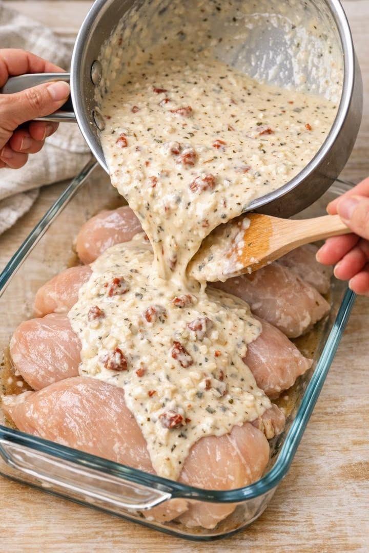 This is one of those pour-and-bake dinners that feels like a hug at the end of a long day. You whisk together one creamy sauce with heavy cream, sun-dried tomatoes, Parmesan, Italian seasoning, and garlic, then simply pour it over raw chicken breasts in a glass casserole dish and let the oven do the rest. It’s very much a Midwest-style comfort bake—simple ingredients, big flavor, and hardly any fuss—perfect for busy nights when you still want something that feels a little special.