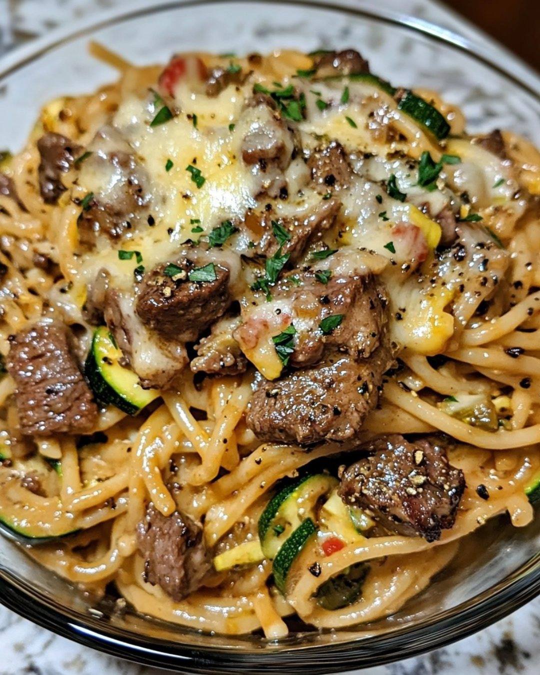 This bold and comforting pasta brings steakhouse flavor home—tender, seared steak bites layered over silky spaghetti and tossed with sautéed zucchini, all coated in a rich garlic parmesan cream sauce. It’s indulgent yet balanced, hearty yet fresh, and absolutely packed with flavor. ![]()