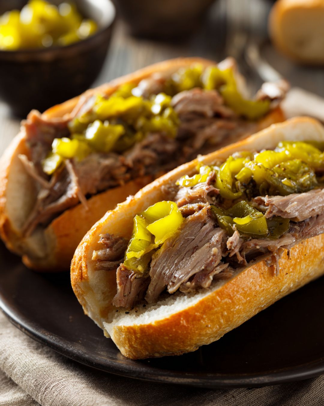 Pile the hot Italian beef onto the rolls, spooning a bit of the juice over the meat if you like a wetter sandwich. Add some of the cooked pepperoncini on top for extra tang and heat.