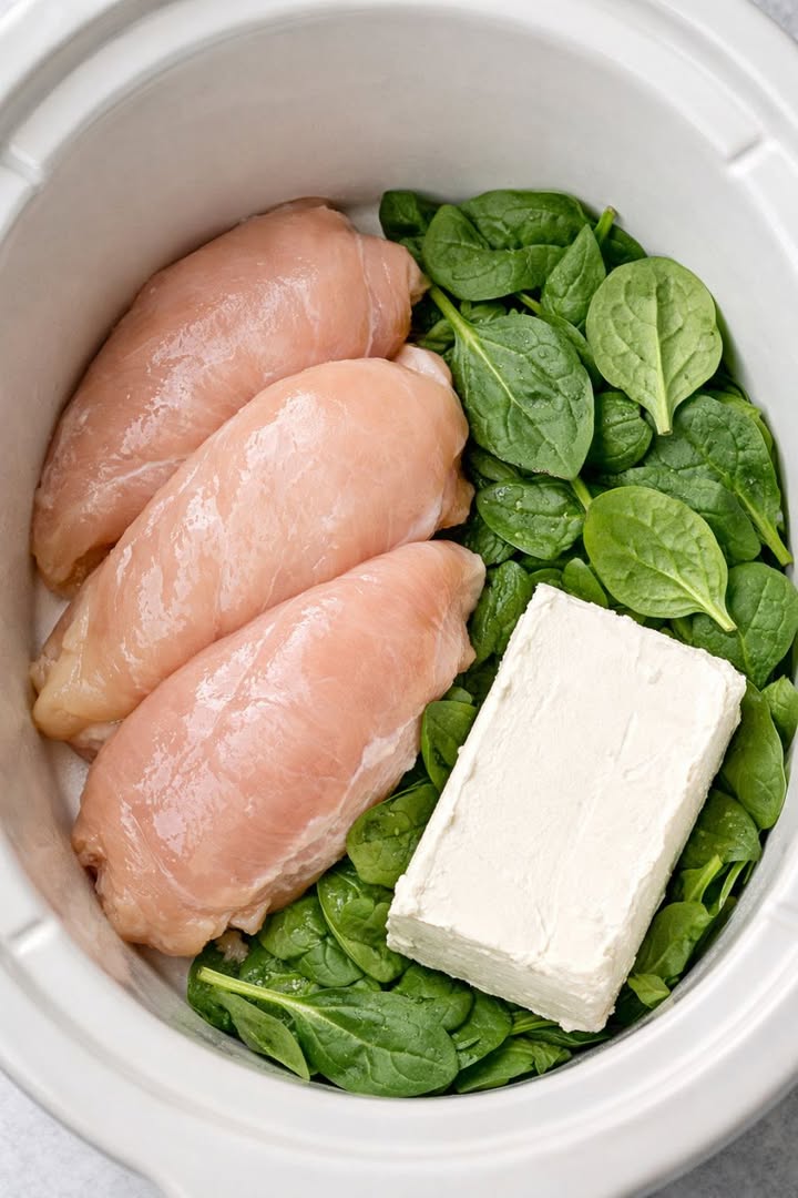 Place the raw chicken breasts in an even layer on the bottom of the slow cooker insert.