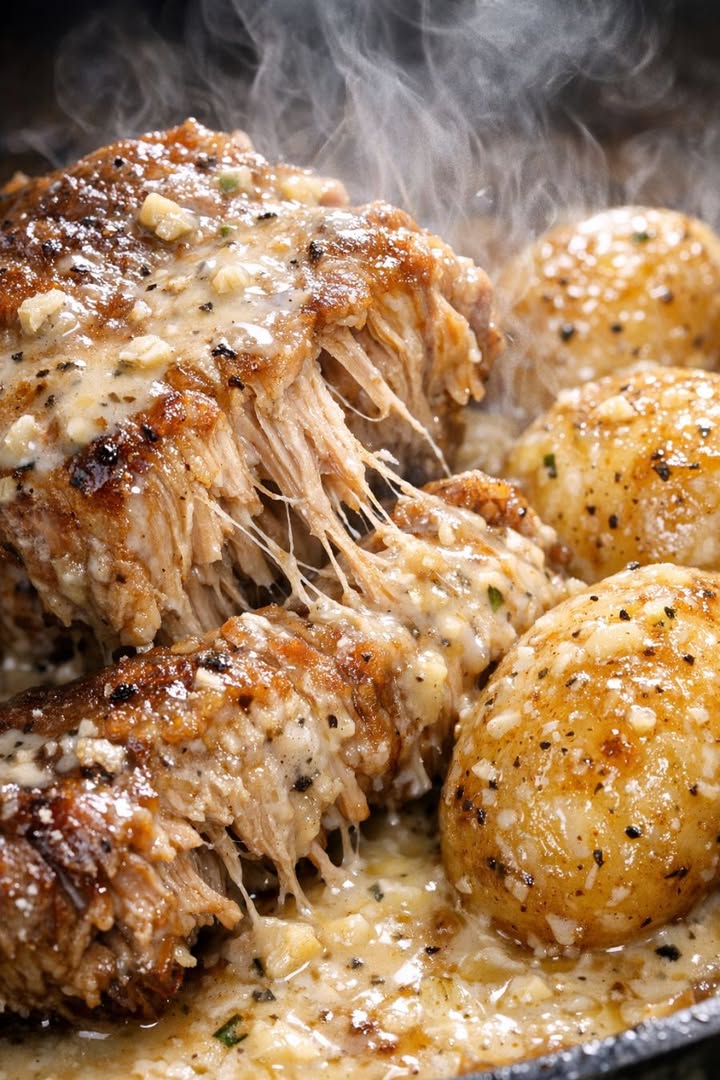 To keep this in the spirit of a four-ingredient Valentine’s dinner, any changes should be optional and minimal. If you’d like a slightly thicker, almost gravy-like sauce, mash a few of the cooked potatoes directly into the cream at the end and stir gently; their starch will naturally thicken the sauce without adding anything new. For a subtle herb note without buying extra ingredients, finish the dish with a small pinch of any dried herb you already have on hand—thyme, rosemary, or Italian seasoning all work—sprinkled over the top right before serving. If you prefer a lighter sauce, you can replace up to 1/2 cup of the heavy cream with milk or water; the sauce will be a bit thinner but still pleasantly garlicky and rich. For those cooking for two, halve the recipe and use a smaller slow cooker if possible, or cook the full batch and slice leftover pork for sandwiches the next day, reheating it gently in the leftover sauce on the stovetop. Finally, if your pork chops are very lean, you can tuck them slightly deeper into the potatoes so they stay extra moist and almost shred when you lift them out, matching that pull-apart, braised texture you’d expect from a restaurant-style dish.