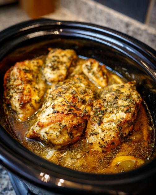 In another bowl, combine the minced garlic, chicken broth, and lemon juice. Pour this mixture over the chicken in the slow cooker.