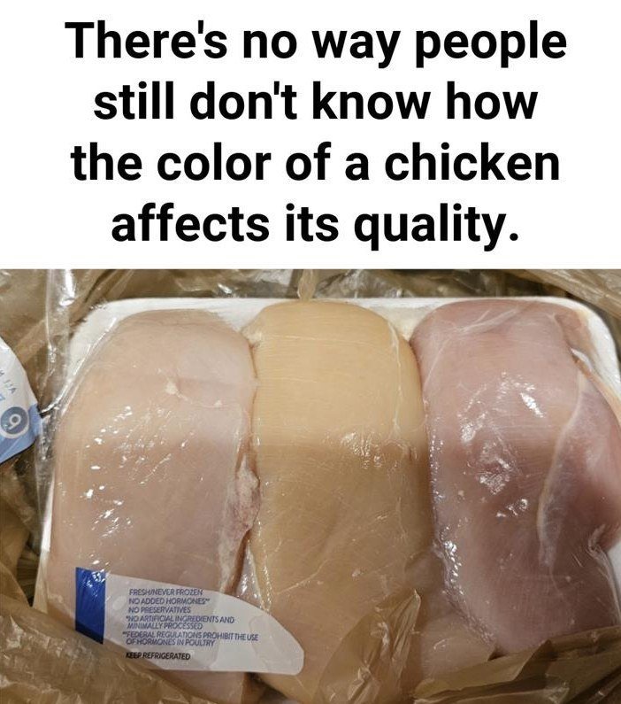 Chicken color does reveal something, but not quality the way most people assume. White chicken usually comes from indoor, factory-farmed birds fed grains like corn, wheat, and soy. These birds grow fast, exercise little, and rarely see the outdoors. Their meat ends up pale pink or white, sometimes with a bluish tint.